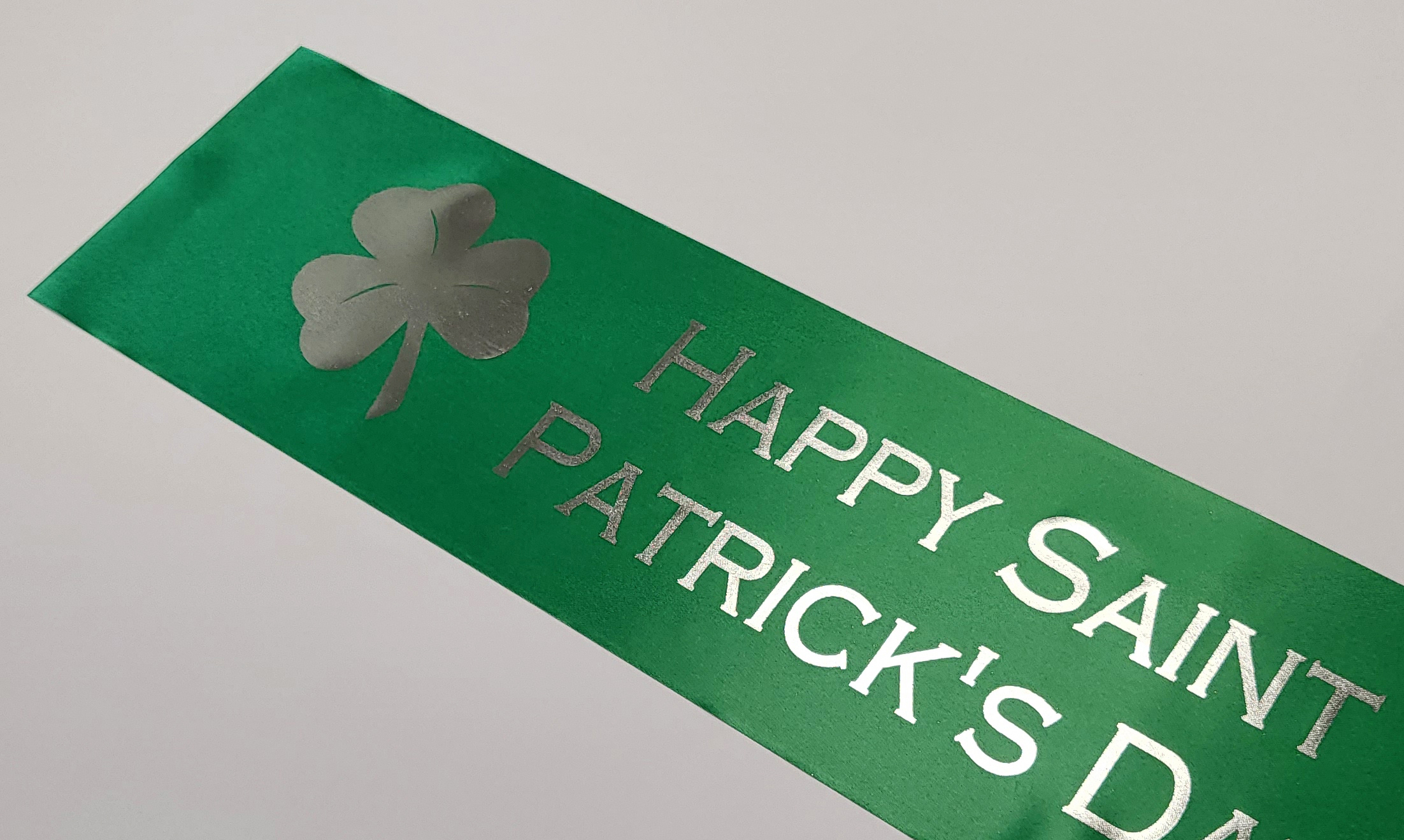 Green St Patrick’s Day Banner or ribbon with silver metalllic print