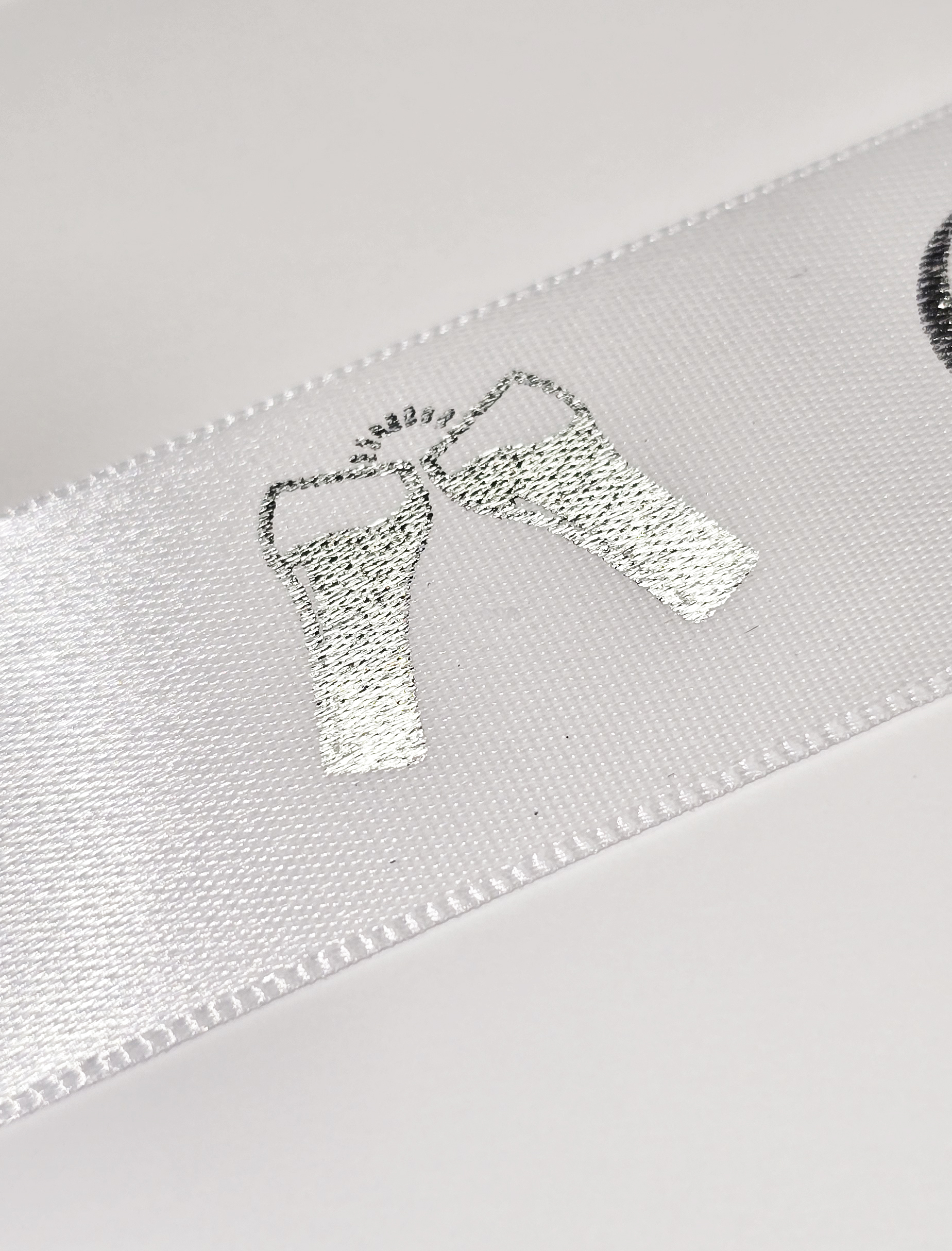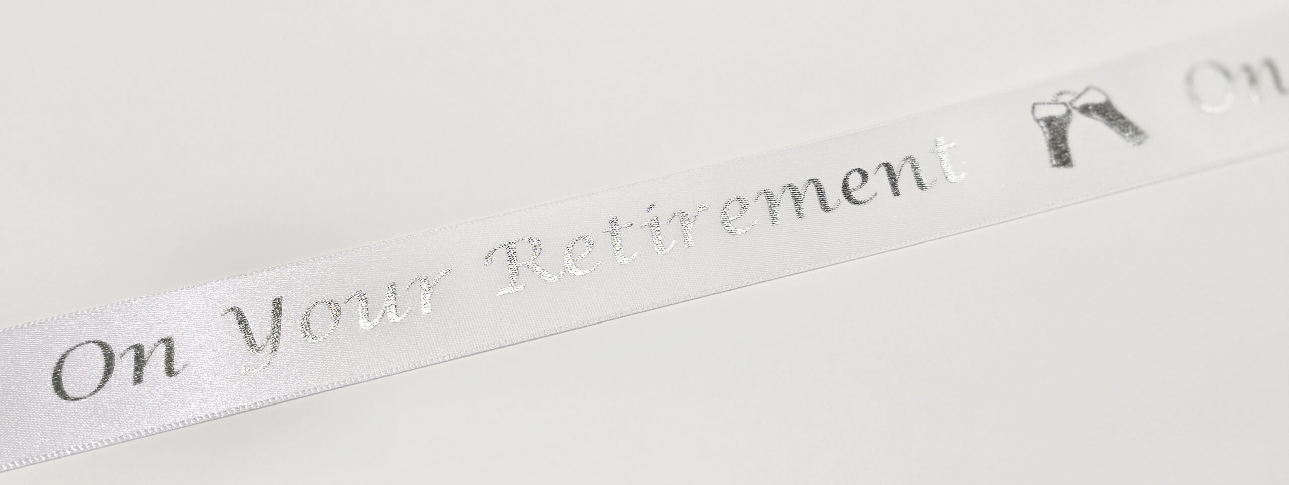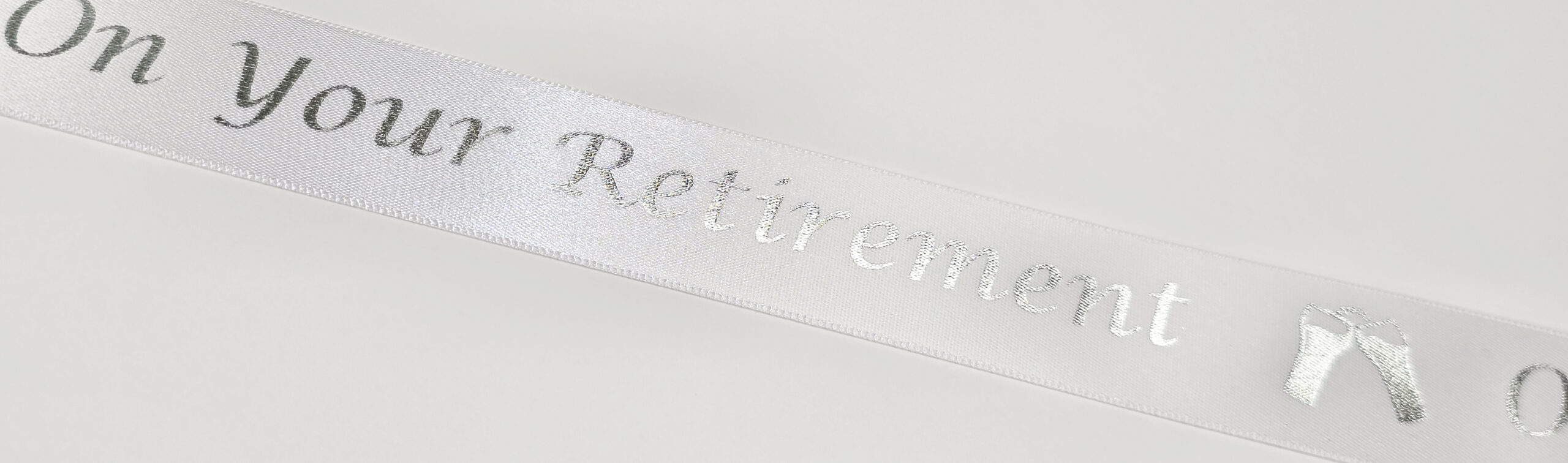 On Your Retirement white satin ribbon with a silver metallic print 25mm x 1m
